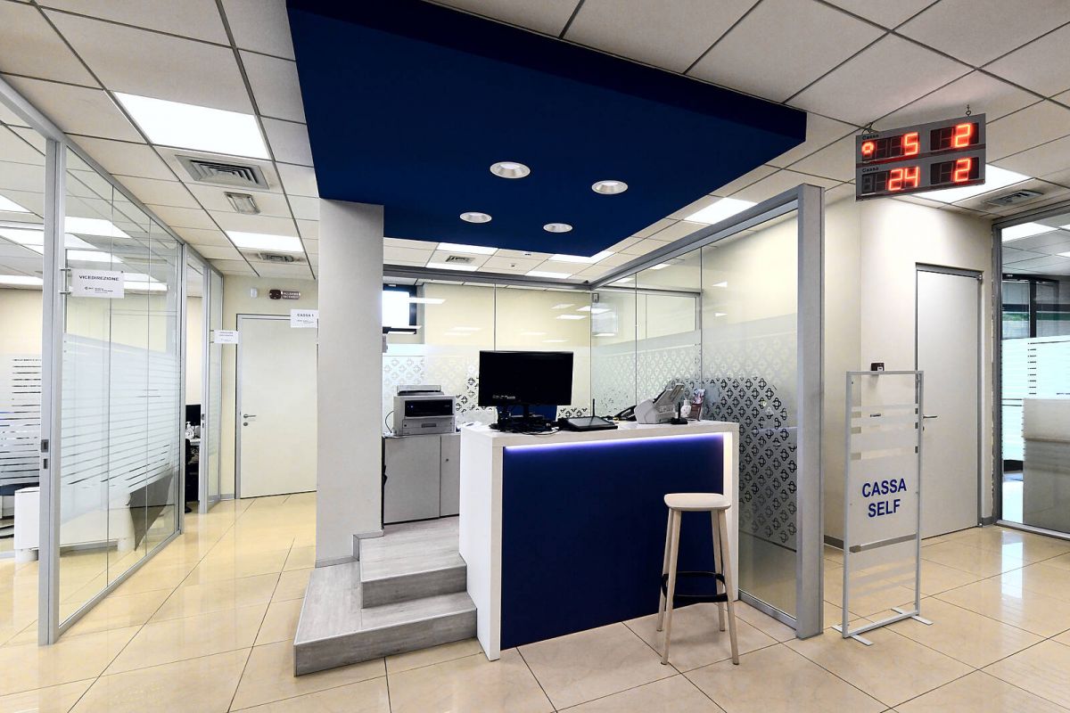 realizzazioni: Banca alta Toscana - Ag. S. Piero Agliana Intervento chiavi in mano per modifica del layout interno con creazione di area self e nuovo punto accoglienza, oltre ad ampliamento dell'agenzia e realizzazione di nuovi uffici.